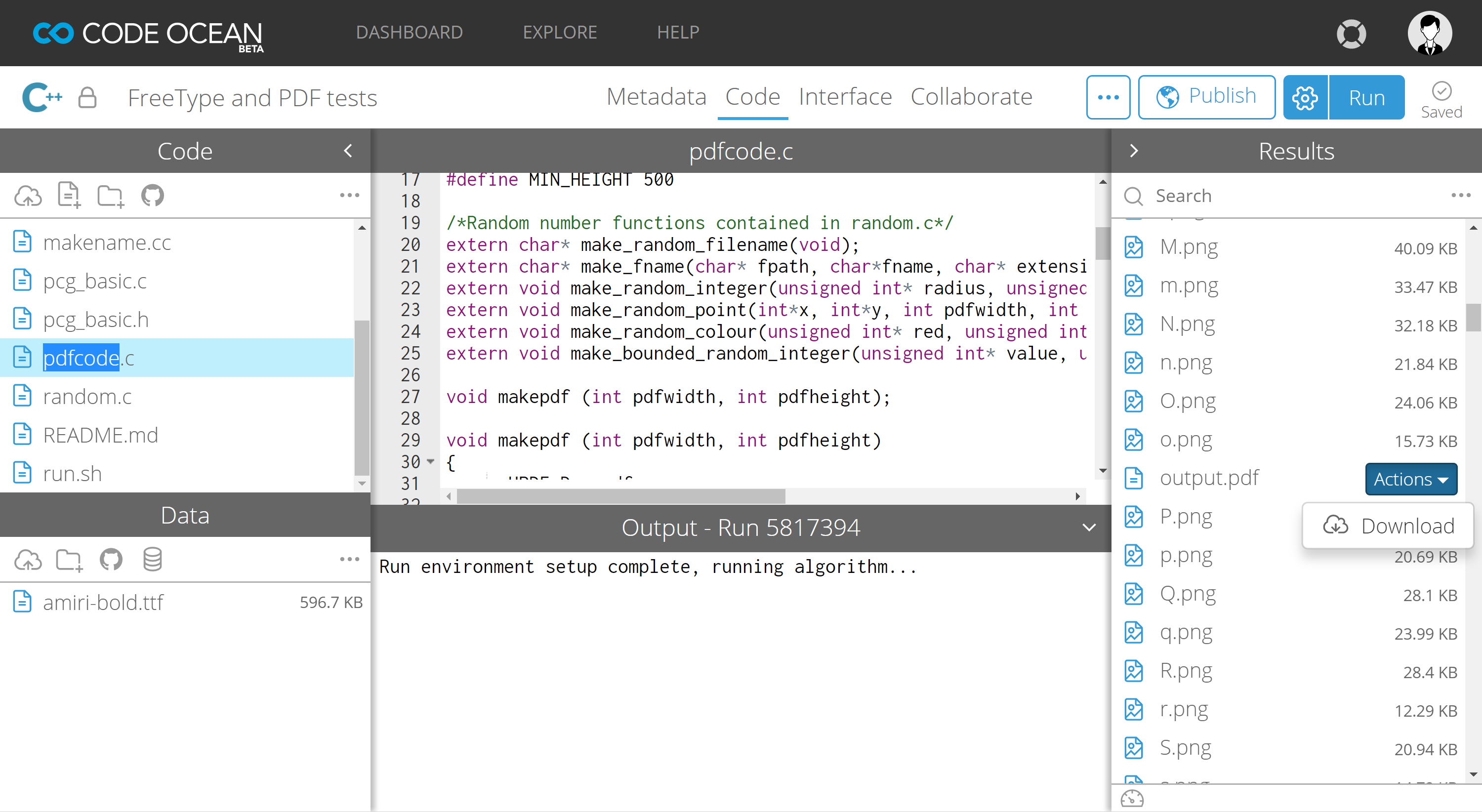 Subsequent to publication of this blog post on 21 September 2017, Overleaf and Code Ocean decided to publish the example Code Ocean project discussed within this article. It was released on 7 November 2017 and is now available on the Code Ocean platform: FreeType and PDF tests for Overleaf/Code Ocean blogpost.