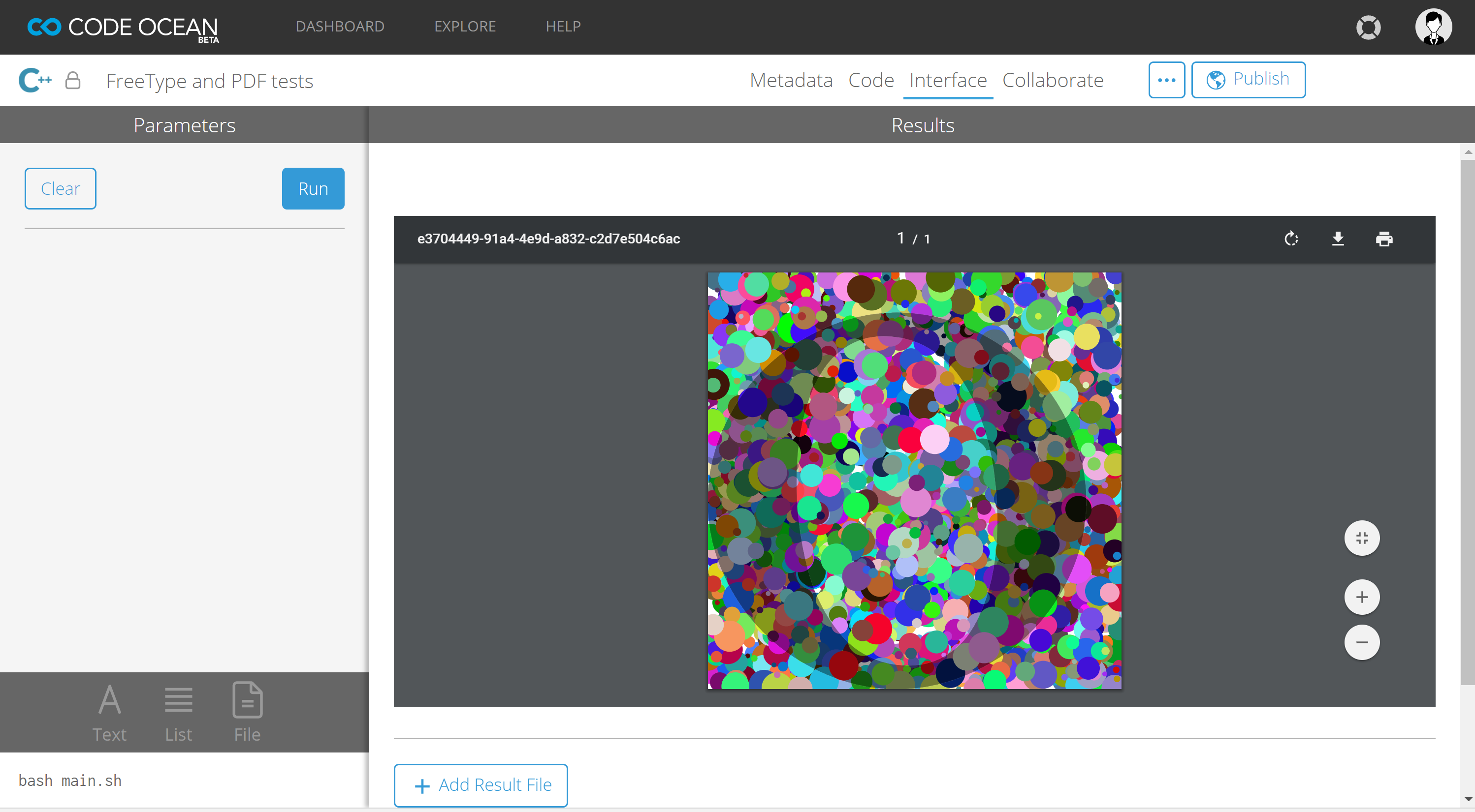 Here is a very simple interface added to my project—I did not implement the ability for a user to input data values (change parameters) and pass those to my code but, of course, that is supported by Code Ocean’s interface designer. This interface simply allows you to run the program and view the results produced by my project: a PDF file containing a transparent PNG graphic superimposed on top of coloured circles.